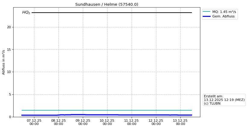 Die Berechnung des Durchflusses erfolgt anhand der derzeit gültigen W-Q Tabelle, wobei hierzu der Wasserstand aktuell um -9 cm korrigiert wird.